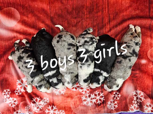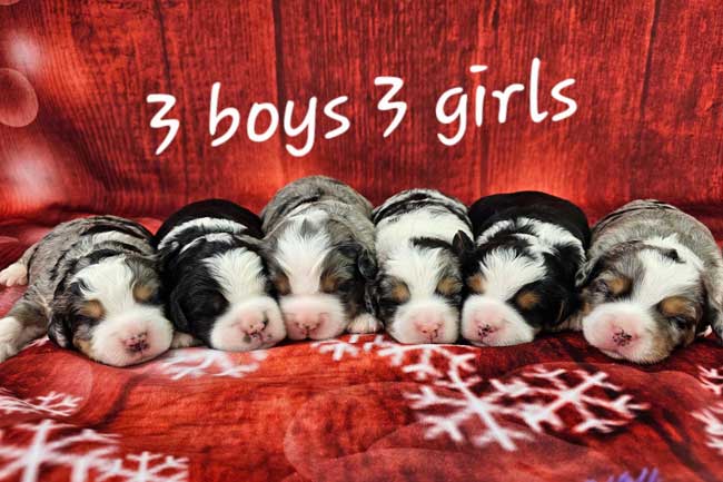 Both of the parents are health genetic tested to ensure that none of the puppies are affected by any hereditary health problem the breed may have. Mom (Bessie) is a 65 lb. AKC registered Bernese Mt. Dog, Dad (Diamond) is also an AKC registered Mini. Poodle weighing 9 lbs. Estimated Adult weight is 25-35 lbs.