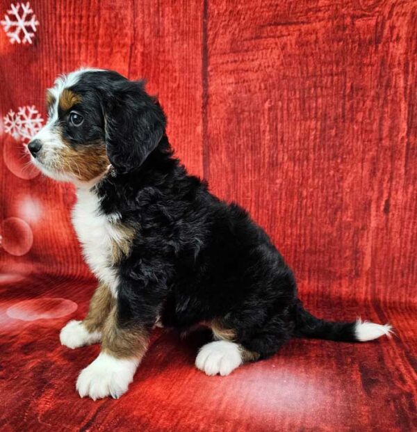 Both parents are Health Genetic tested. Mom (Rainie) is a 50 lb. AKC registered Bernese Mt. Dog, Dad (Frisco) is a red & white, AKC registered Toy Poodle weighing 9 lbs. Estimated Adult weight is 25-30 lbs.