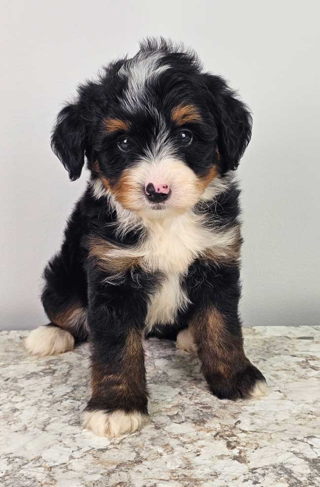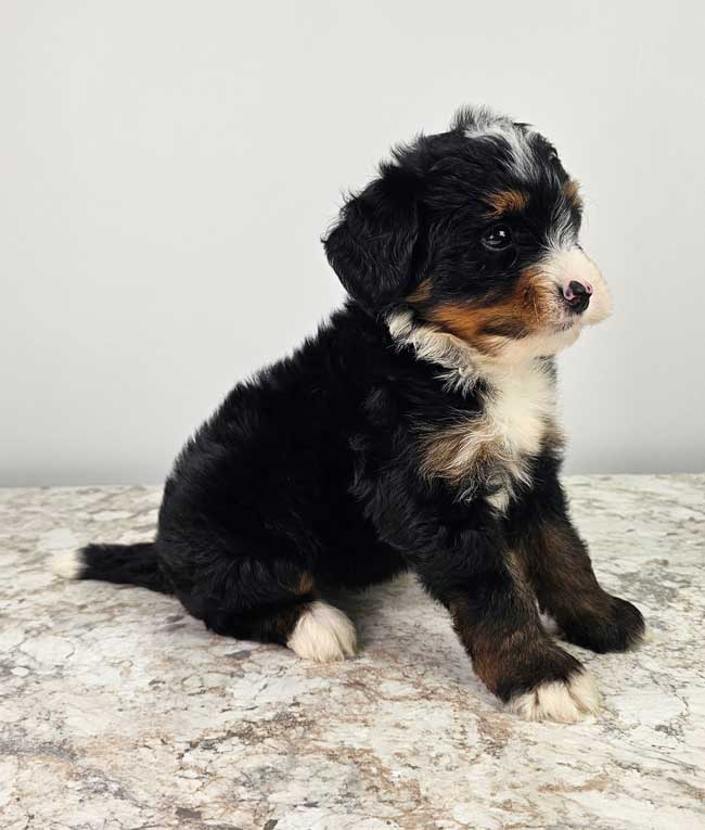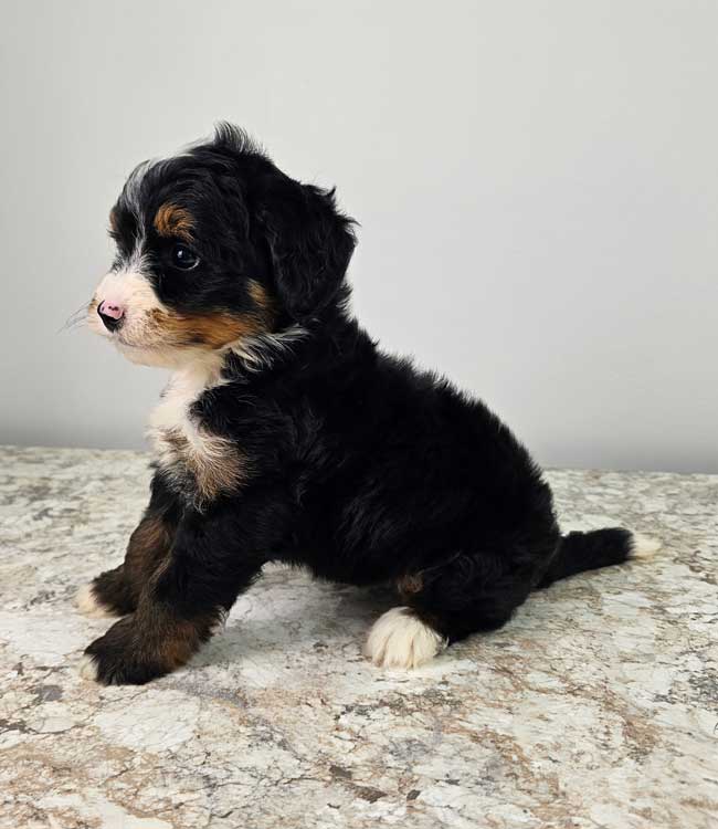 Both of the parents are health genetic tested to ensure that none of the puppies are affected by any hereditary health problem the breed may have. Mom (Gina) is a 72 lb. AKC registered Bernese Mt. Dog,  Dad (Blake) is also an AKC registered Mini. Poodle weighing 9 lbs. Estimated Adult weight is 25-35 lbs.