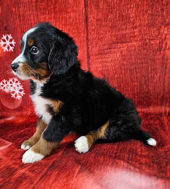 Both parents are Health Genetic tested clear. Mom (Holly) is a 72 lb. AKC registered Bernese Mt. Dog, Dad (Tyson) is an AKC Registered, Black party tri mini. Poodle weighing 14 lbs. Estimated Adult weight is 25-40 lbs.