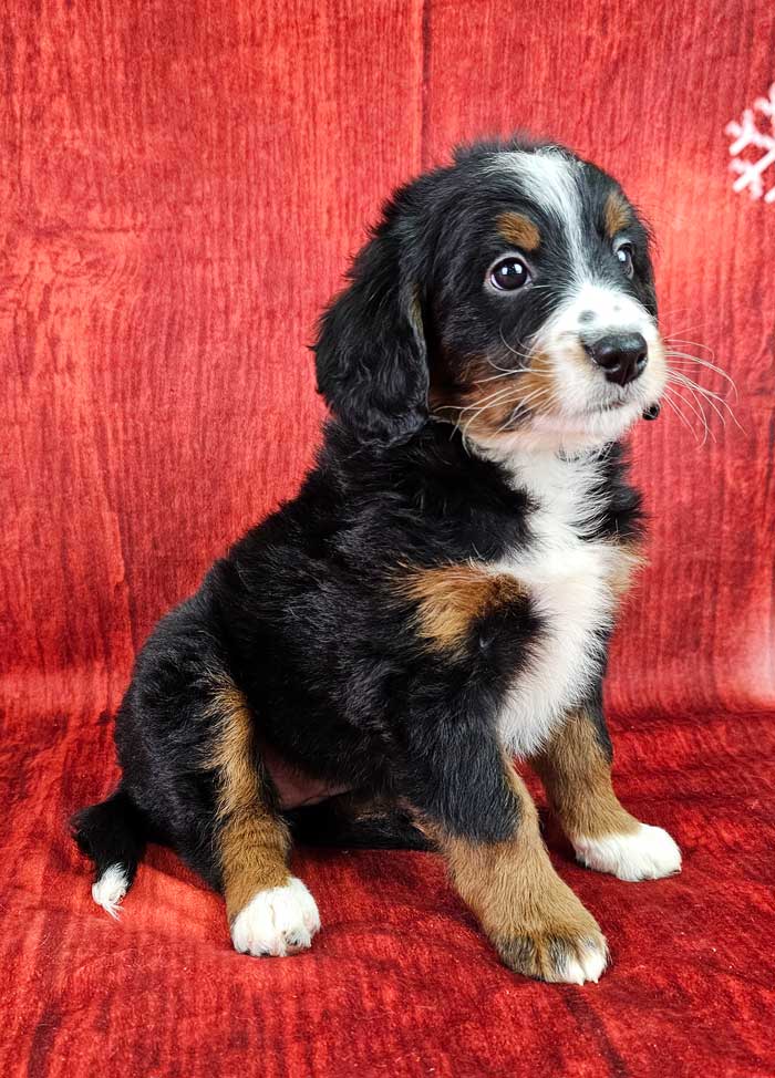 If we could nominate one of these mini Bernedoodles as a total boss babe among the littermates Harmony would get that title hands down! She is adventure driven and pounces, prances, and plays like she’s a superhero in training- always trying to impress with a sense of confidence and pride! This girl loves to be affirmed and adored making sure her every move is naturally creating a built in fan club! Harmony will slather you with kisses but still has a casual independent streak to let you know she’s got everything under control! If you are looking for a sparkle of sassy, a side of classy, and a huge heap of good ol’ fashioned fun- Harmony is ready to make your heart sing!