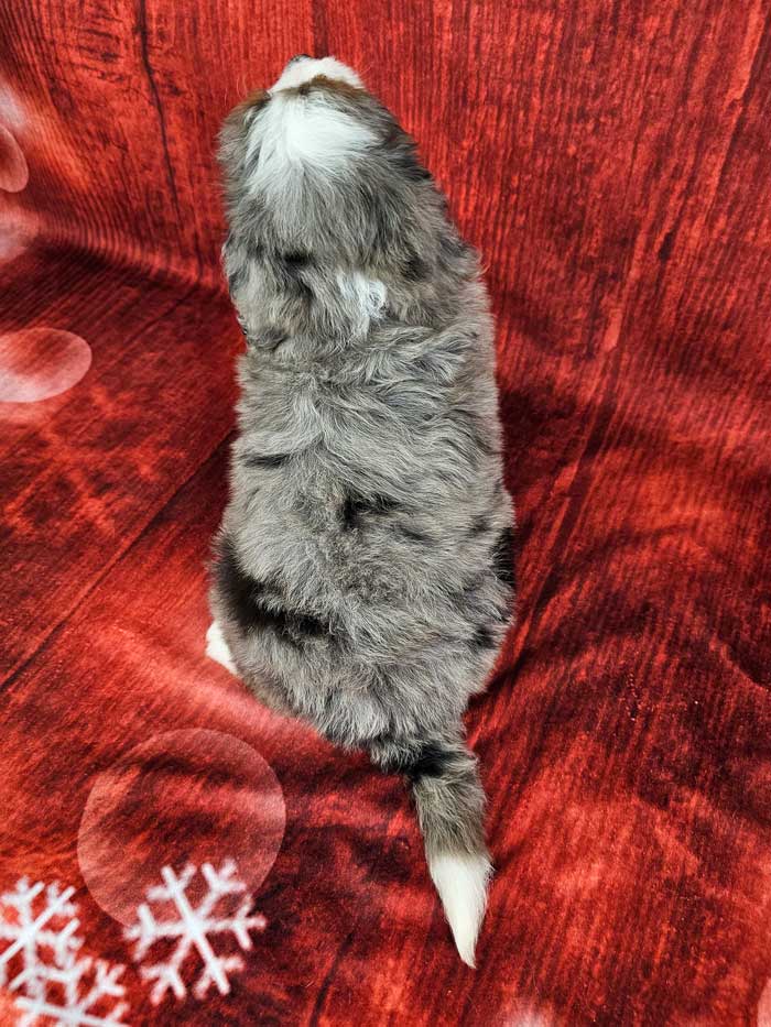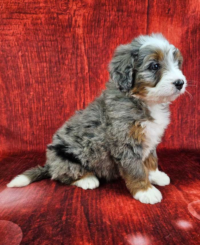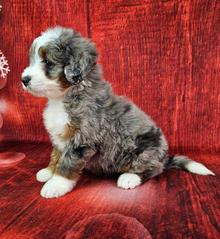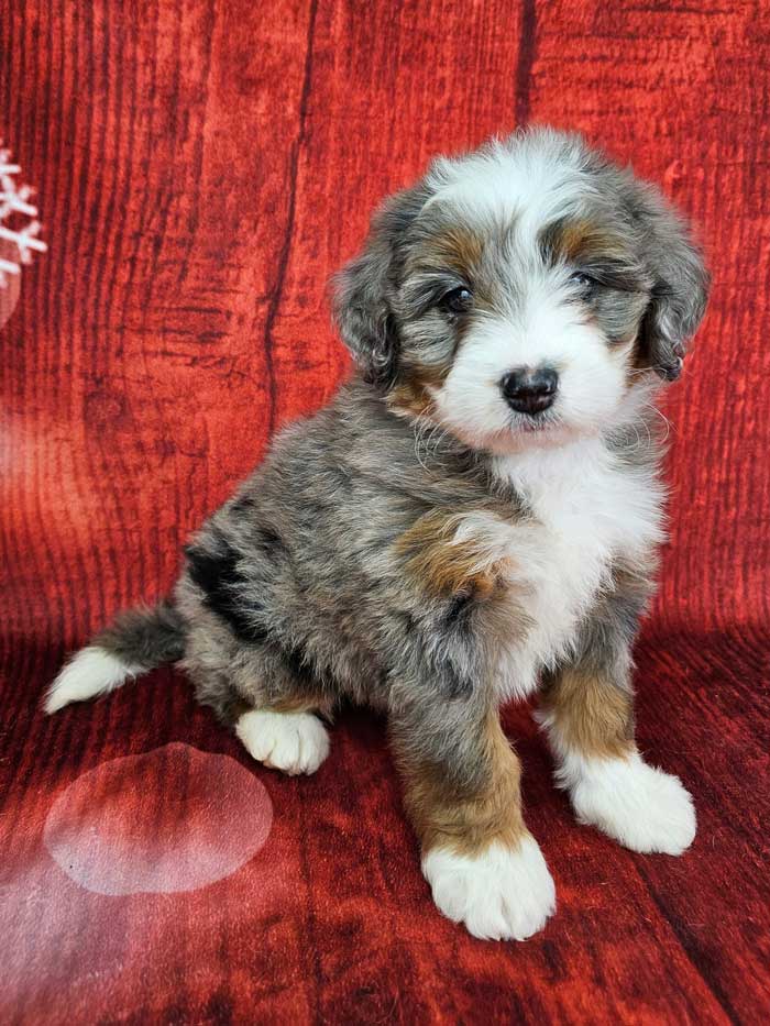Both parents are Health Genetic tested. Mom (Jewel) is a 74 lb. AKC registered Bernese Mt. Dog, Dad (Denali) is a Blue merle party tri Mini. Poodle weighing 15 lbs. Estimated Adult weight is 30-40 lbs.