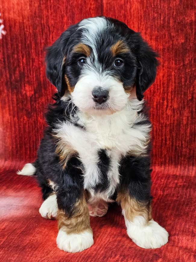 Both of the parents are health genetic tested to ensure that none of the puppies are affected by any hereditary health problem the breed may have. Mom (Nova) is a 80 lb. AKC registered Bernese Mt. Dog, Dad (Bruno) is also an AKC registered Mini. Poodle weighing 16 lbs. Estimated Adult weight is 25-40 lbs.