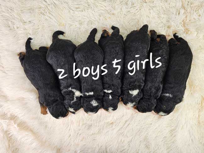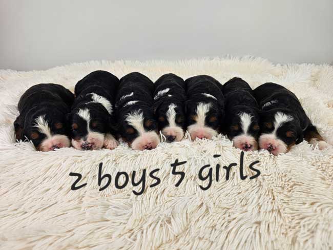 Both of the parents are health genetic tested to ensure that none of the puppies are affected by any hereditary health problem the breed may have. Mom (Nova) is a 80 lb. AKC registered Bernese Mt. Dog, Dad (Bruno) is also an AKC registered Mini. Poodle weighing 16 lbs. Estimated Adult weight is 25-40 lbs.