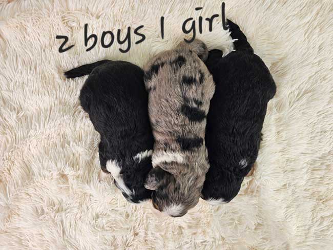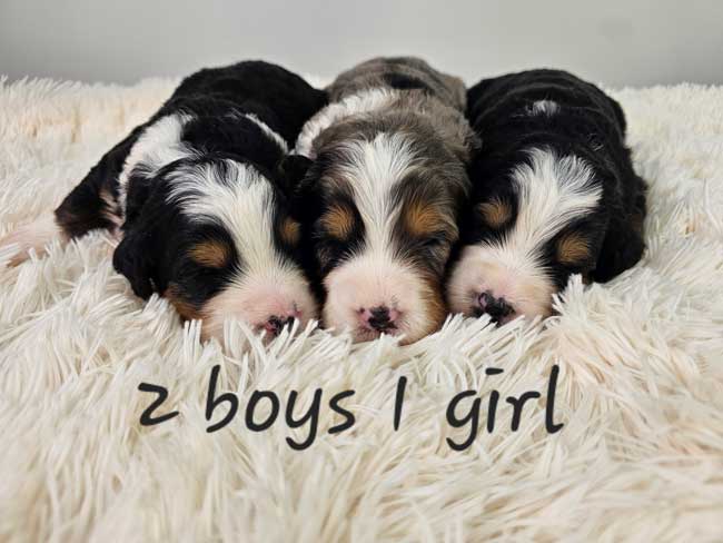 Both of the parents are health genetic tested to ensure that none of the puppies are affected by any hereditary health problem the breed may have. Mom (Olivia) is a 96 lb. AKC registered Bernese Mt. Dog, Dad (Blake) is also an AKC registered Mini. Poodle weighing 9 lbs. Estimated Adult weight is 25-40 lbs.