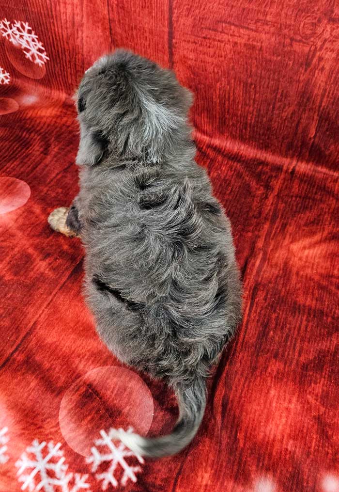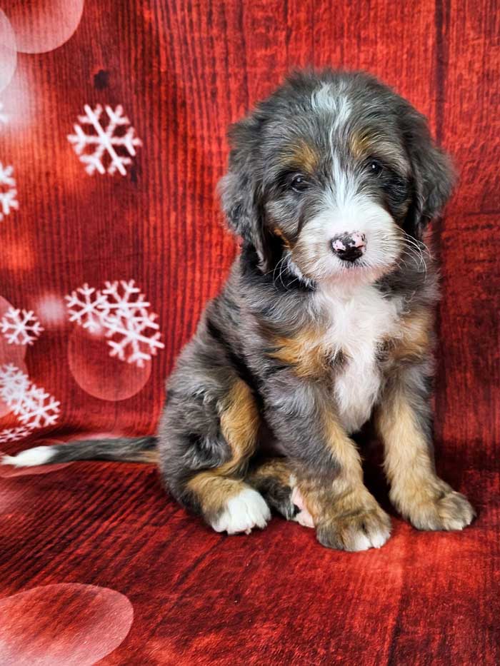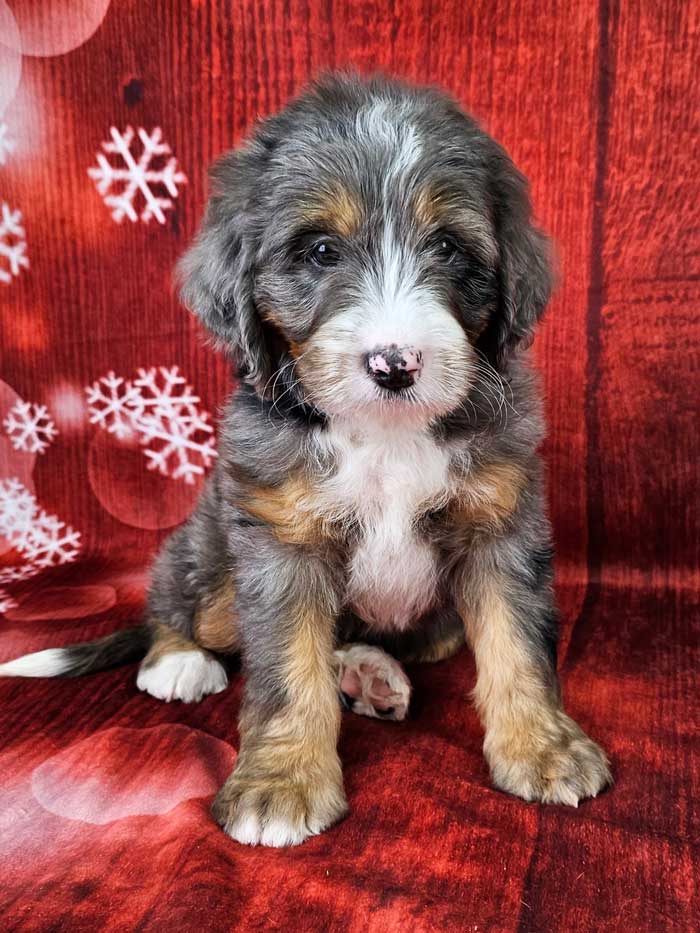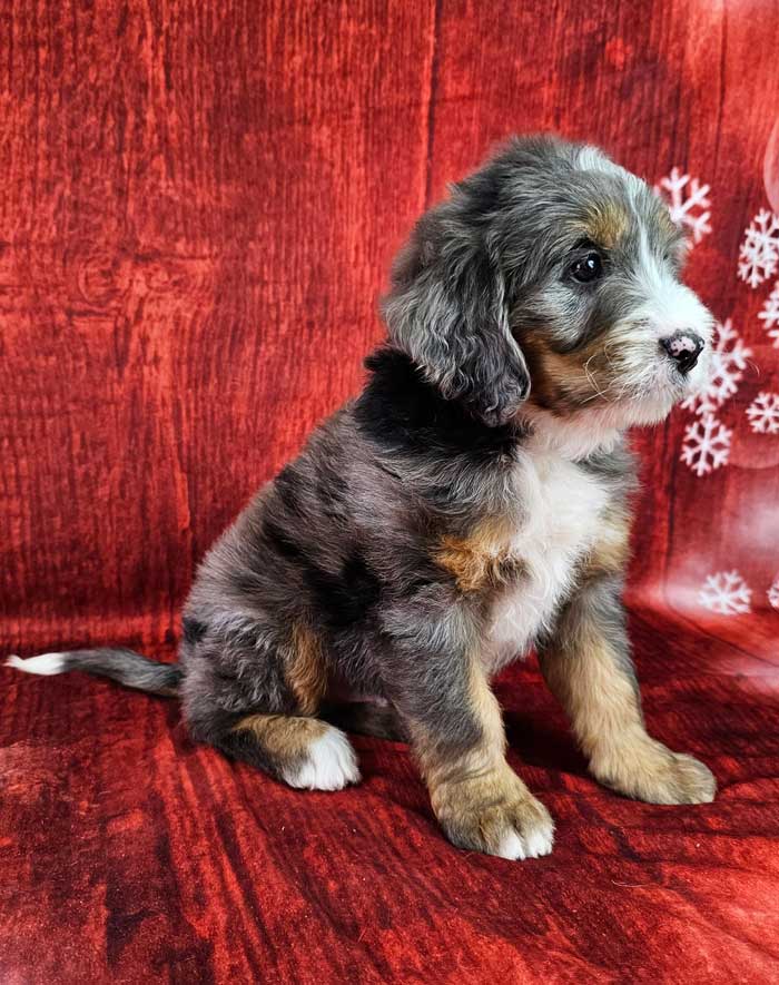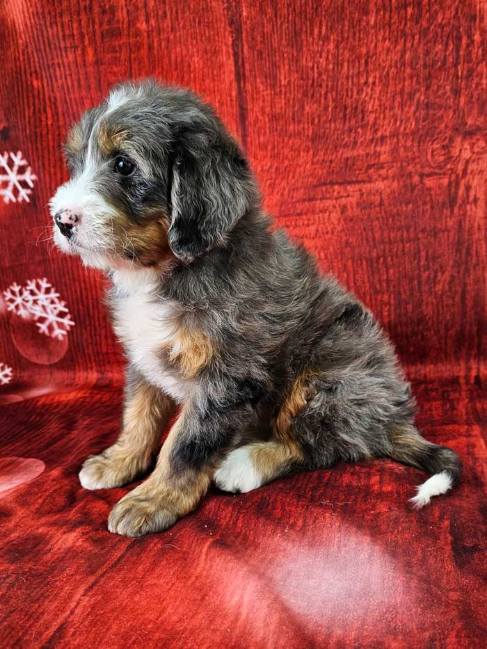Both parents are Health Genetic tested. Mom (Serry) is a 85 lb. AKC registered Bernese Mt. Dog, Dad (Cobalt) is an AKC Registered, Blue merle party tri mini. Poodle weighing 17 lbs. Estimated Adult weight is 30-45 lbs.
