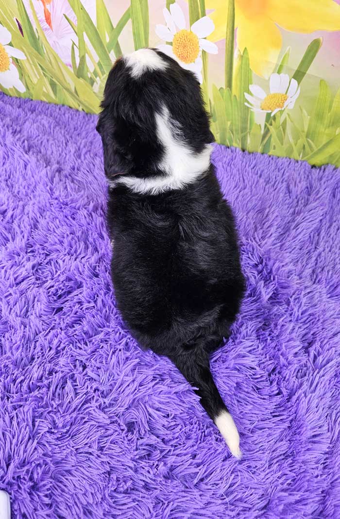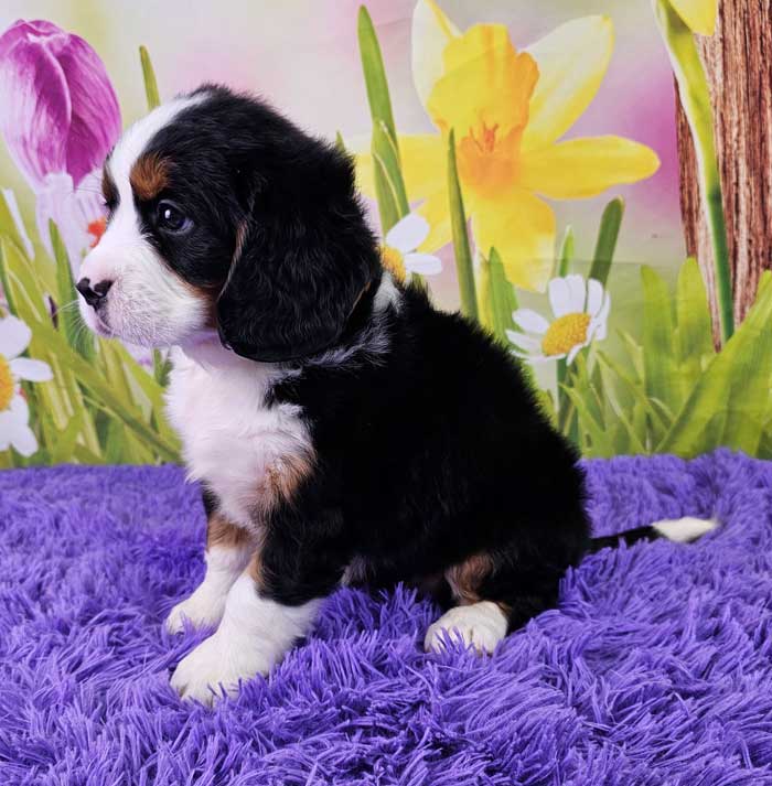 Our first generation Mini Bernese puppies are a cross between a Bernese Mt. dog and a King Charles Spaniel Cavalier. Love the charming personality and striking looks of the majestic Bernese Mt dog but don’t have the space? The Mini Bernese is a great alternative for smaller homes and apartments. The temperament of these little charmers is most endearing. They are known for their friendly and gentle disposition, making them perfect for families, offering affection and loyalty in abundance .Their intelligence and gentle temperaments make them easy to train. They are great with children and other pets and enjoy hiking and swimming. Daily exercise, play time and mental stimulation keeps them happy and healthy. Average expected lifespan is 10 to 14 years. Standing 12 to 20 inches tall, they can weigh from 25 to 50 pounds depending on size of parents.