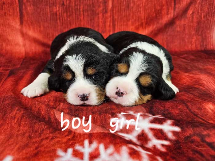 Both of the parents are health genetic tested to ensure that none of the puppies are affected by any hereditary health problem the breed may have. Mom (Zoey) is a purebred AKC Registered Bernese Mt Dog, weighing 65 lbs. Dad (Maxwell) is a purebred AKC Registered King Charles Cavalier weighing 16 lbs. Estimated Adult weight is 30-45 lbs.