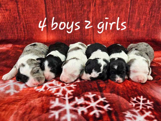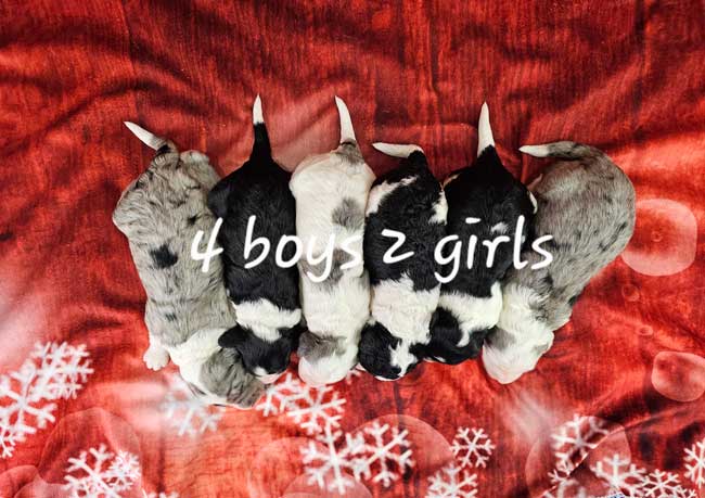 Both of the parents are health genetic tested to ensure that none of the puppies are affected by any hereditary health problem the breed may have. Mom (Bailey) is a 57 lb. first generation Standard Sheepadoodle. Dad (Blake) is an AKC registered Mini Poodle weighing 9 lbs. Estimated Adult weight is 25-40 lbs.